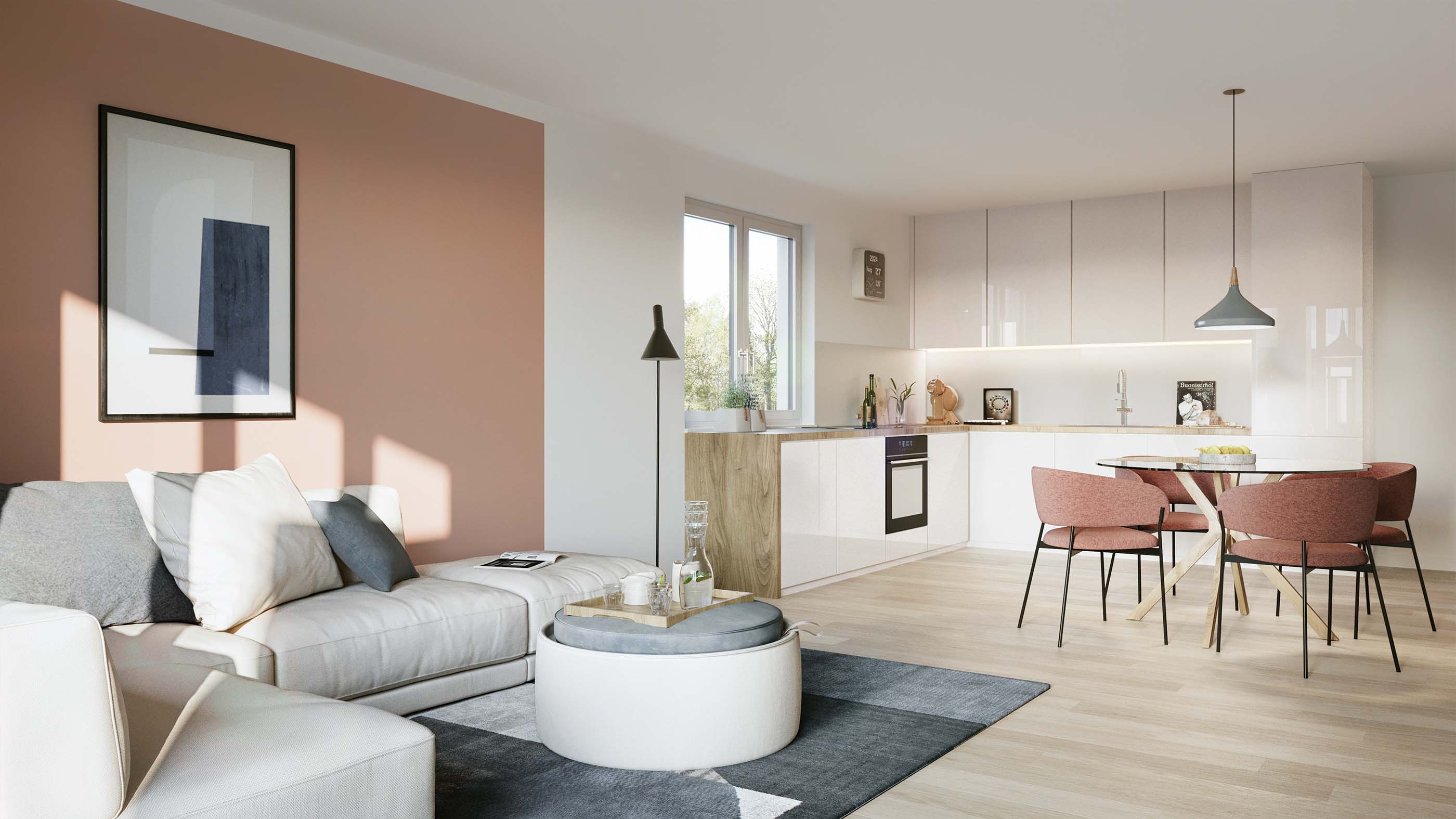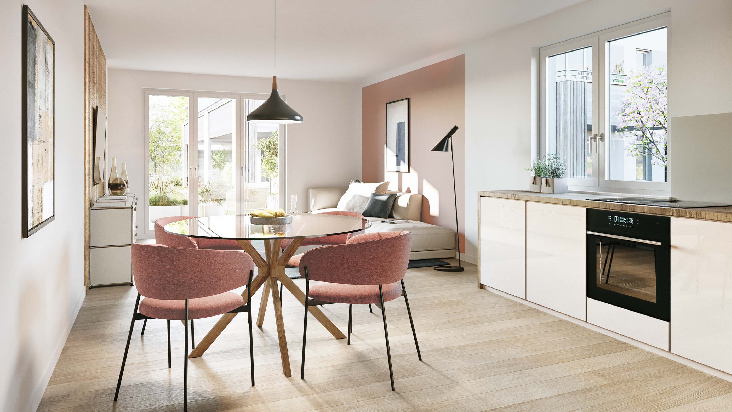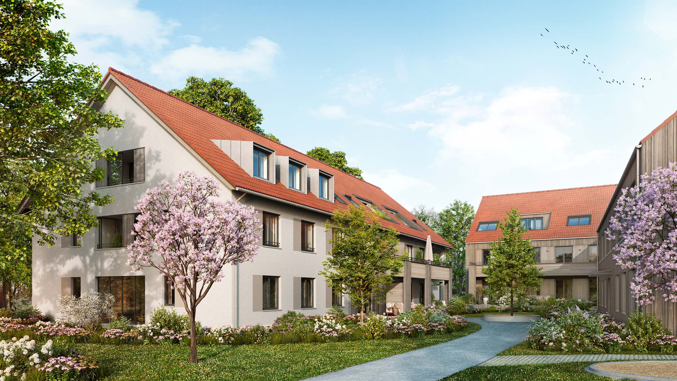 Die Wohnungen bieten 2 bis 5 Zimmer auf 47 bis 115 m² Wohnfläche. Erdgeschosswohnungen verfügen über eine Terrasse, im ersten Obergeschoss laden sonnige Balkone zum Verweilen ein, und im Dachgeschoss erwarten Sie entzückende Loggien unter freiem Himmel. Offene Küchen mit Wohn- und Essbereich, optimierte Grundrisse und je zwei Badezimmer in den 3- und 4-Zimmerwohnungen - eines davon jeweils en suite - sorgen für hohen Wohnkomfort.